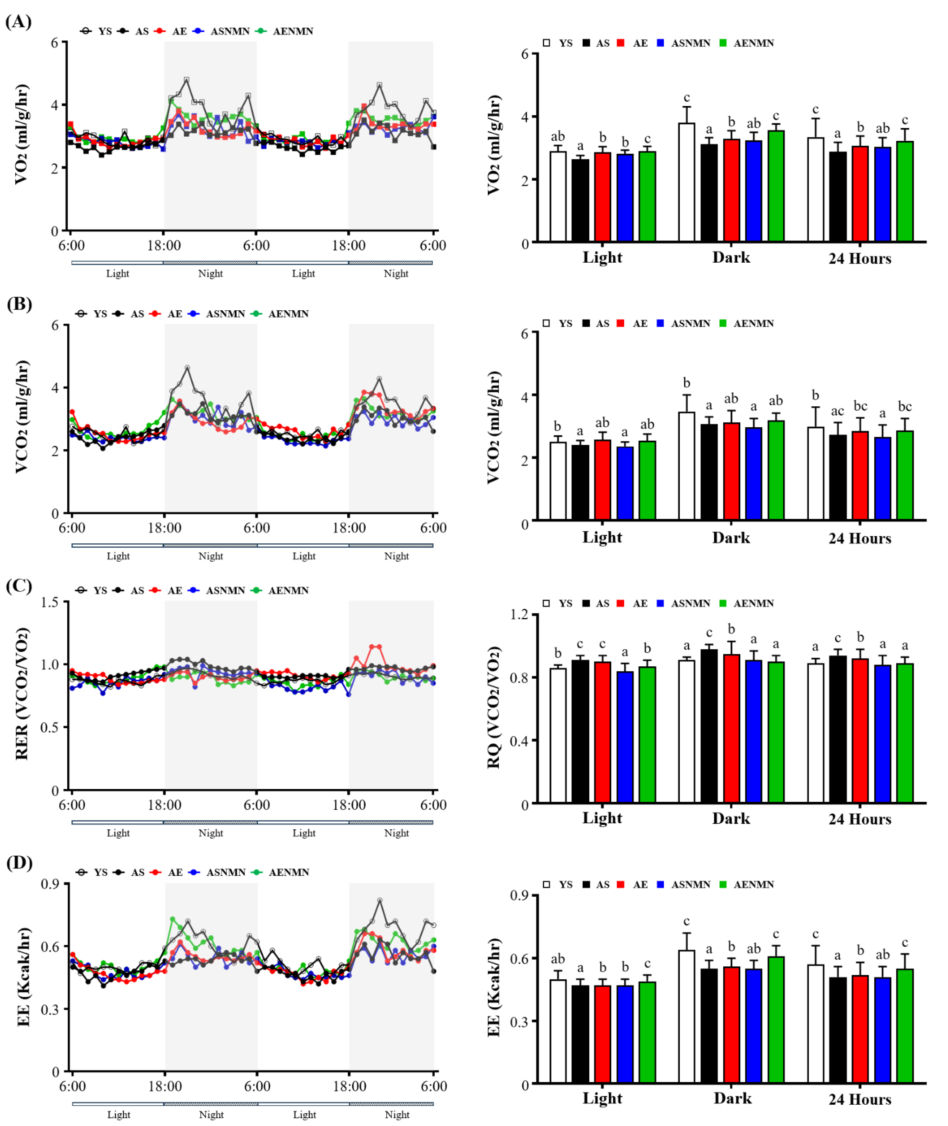 Figure 3. Effect of NMN supplementation and exercise training on (A) oxygen consumption (VO2), (B) carbon dioxide production (VCO2), (C) respiratory exchange ratio (RER), and (D) energy expenditure (EE). Data are expressed as mean ± SD for n = 4 mice in each group. Different superscript letters (a, b, and c) indicate statistically significant differences among groups (p < 0.05, one-way ANOVA with Duncan’s post hoc test). Groups sharing the same letter are not significantly different. YS, young sedentary; AS, aged sedentary; AE, aged with exercise; ASNMN, aged with NMN supplementation; AENMN, aged with combined NMN and exercise.