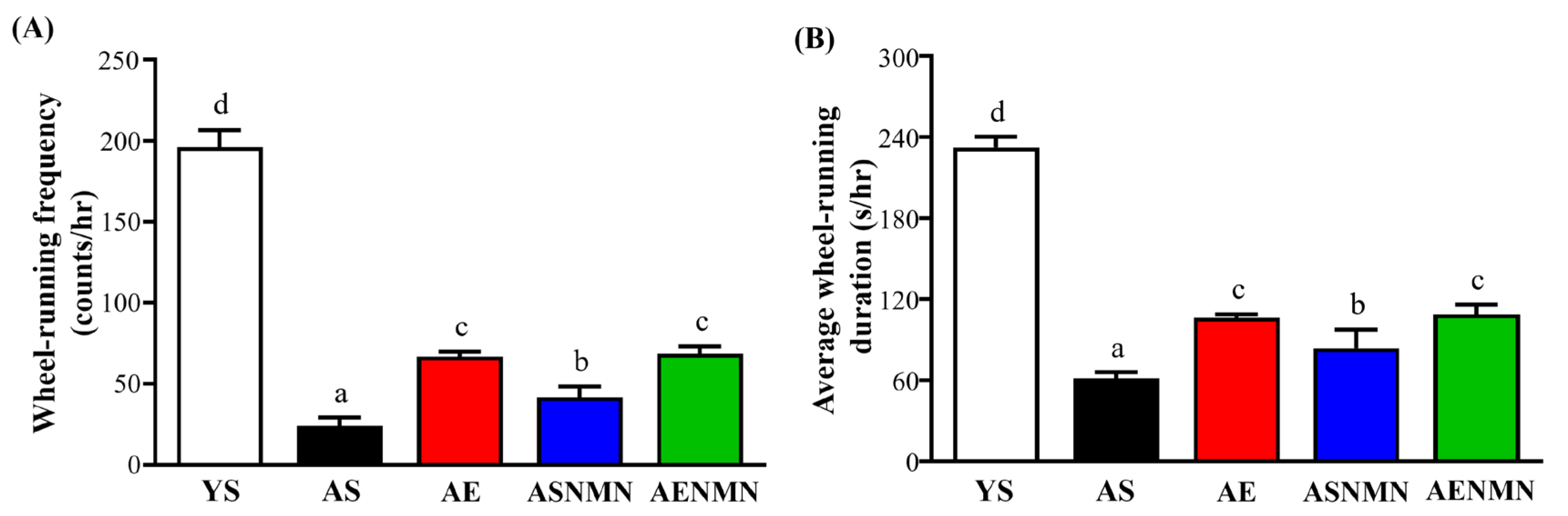 Data on wheel-running activity and usage time are presented in Figure 4A,B. Spontaneous locomotor activity, the AS group showed a significant 87.8% reduction compared to the YS group (p < 0.0001). The AE (p < 0.0001), ASNMN (p = 0.0077), and AENMN (p < 0.0001) groups all displayed significantly improved activity compared to the AS group. Notably, the AENMN group showed the greatest recovery, with a 2.85-fold increase over the AS group (p = 0.0005). Similarly, the average wheel usage time per hour was significantly reduced in the AS group compared to the YS group (p < 0.0001). All interventions increased usage time relative to the AS group, with the AE, ASNMN, and AENMN groups showing 1.73-fold (p < 0.0001), 1.37-fold (p = 0.0069), and 1.77-fold (p < 0.0001) increases, respectively. The AENMN group showed the greatest improvement, with a 77.5% increase over the AS group (p = 0.0038).