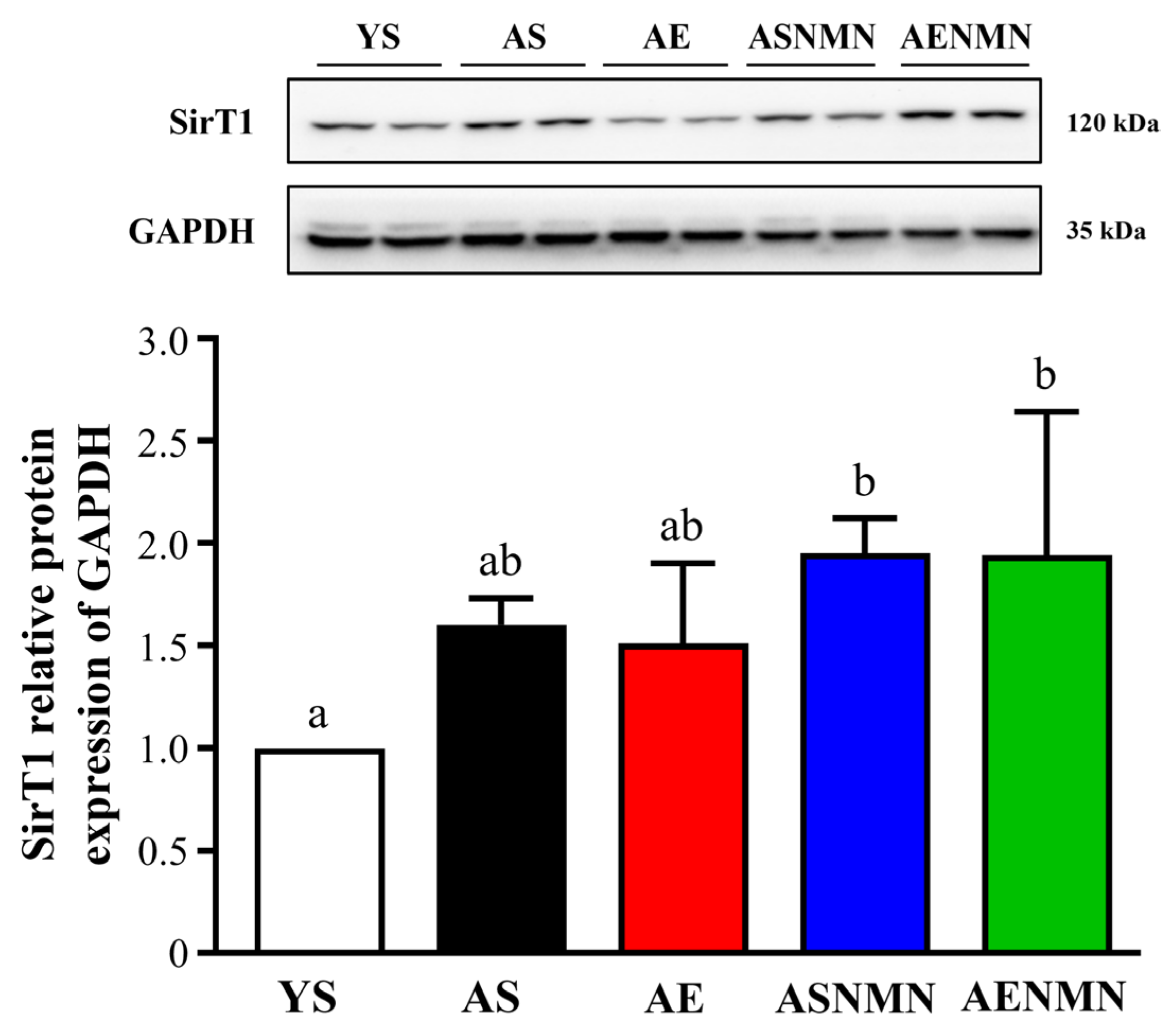 Figure 8. Effects of NMN supplementation and aerobic exercise training on SirT1 protein expression in skeletal muscle, as determined using Western blot analysis. Data are expressed as mean ± SD for n = 2 mice in each group. Different superscript letters (a and b) indicate statistically significant differences between groups (p < 0.05, one-way ANOVA with Duncan’s post hoc test). Groups sharing the same letter are not significantly different. YS, young sedentary; AS, aged sedentary; AE, aged with exercise; ASNMN, aged with NMN supplementation; AENMN, aged with combined NMN and exercise; SirT1, sirtuin 1.