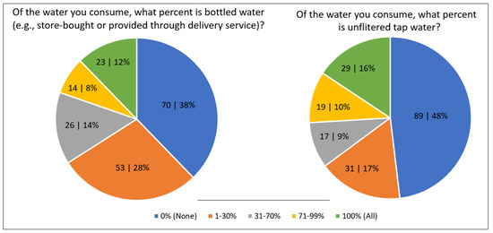 Among beverages, water was consumed in greatest daily abundance (1413 g/day) on both a per capita and consumers-only basis. Figure 1 presents the response distribution for water intake. For sources of water (including water for beverages, soups, etc.), two-thirds of participants said they consumed up to 30% of their daily water as store-bought bottled water or water provided by a delivery service, with 20% ingesting most (>70%) of their water from such sources. 1 in 4 (26%) said they consumed >70% of their daily water from unfiltered tap water.