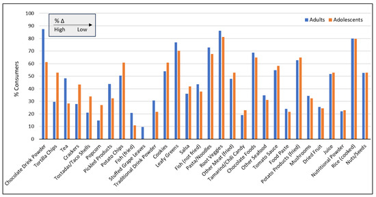Percent of adults and adolescents consuming various foods and beverages, ordered left-to-right based on %Δ (difference in percentages between adults and adolescents).
