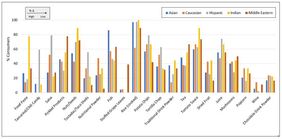 Relative to all other groups, the proportion of nutritional powder consumers was 1.5 to 8.6-times higher among Caucasians, while the proportion of food paste consumers was 2.3 to 5.4-times higher among Indians, and the proportion of tostada/taco shell consumers and salsa consumers was 1.7 to 5.3-times higher and 1.5 to 3.6-times higher, respectively, among Hispanic participants. Chocolate beverage powder, tomato sauce, juice, and rice were among the foods where the proportions of consumers differed least between racial/ethnic groups.