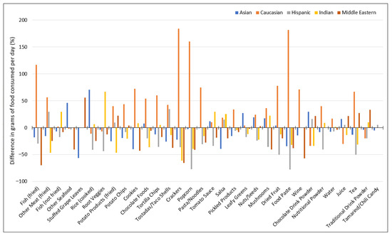 Figure 4 shows the percent difference in the average daily intake of foods and beverages by racial/ethnic group relative to the Group Mean across those racial/ethnic groups. Compared to the Group Mean within each food category, the daily intake of crackers, cookies, popcorn, pasta/noodles, dried fruit, food paste, wine, tea as well as fried fish and other fried meat was considerably (2.5- to 3.5-times) higher among Caucasians, while the daily intake of rice, root vegetables and grape leaves was 71%, 67% and 56% higher among Asians, Indians and Middle Easterners, respectively.