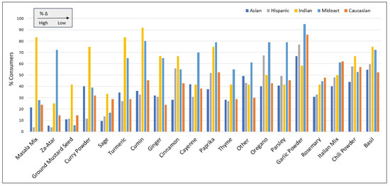 Over half of herbs/spices included in this survey were consumed at least once every other day by consumers, with masala mix being the most frequently consumed on average, followed by curry powder, paprika, garlic powder and chili powder. Most of these herbs/spices showed average intakes of roughly 2 g/day or higher, with statistically significant increases in consumption frequency among Indian participants. Among Middle Easterners, an increased consumption frequency was observed for za’atar and parsley. Masala, za’atar, cumin, curry powder, and turmeric showed the highest variance explained by regression models.