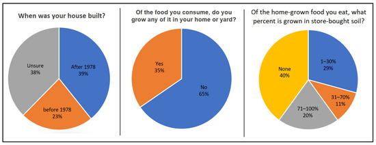 Figure 6 presents the response distribution of participants who answered questions about their home’s construction year, with 23.1% reporting a construction year < 1978, with 39.2% reporting later construction and 37.6% unsure. This distribution changed negligibly (±3%) when examining adults only. The proportion who reported growing at least some food at home was 35%. Of this proportion, 31% reported growing the majority of their homegrown food in store-bought soil (e.g., a raised garden bed), with 40% growing none of their food in store-bought soil.
