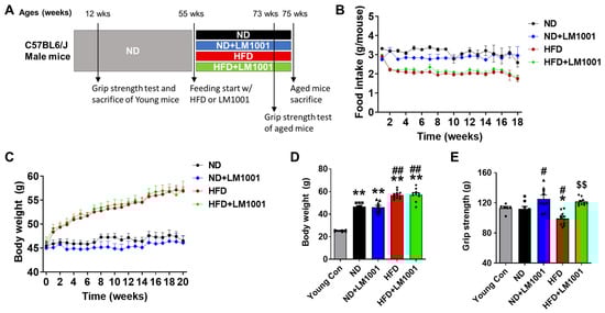 Effect of LM1001 on food intake, body weight, and muscle strength in aged mice. Aged mice (55 weeks old) were fed either ND or HFD for 20 weeks and then sacrificed. Healthy male 12-week-old mice fed ND were used as a young control group. (A) Experimental design of aged mice fed with ND or HFD for 20 weeks. (B) Food intake and (C) the body weight changes in aged mice for 20 weeks of ND or HFD feeding with LM1001 supplementation. (D) Body weight of mice at sacrifice. (E) Handgrip strength was measured at 18 weeks of HFD feeding (n = 6–12). Data are presented as the mean ± SEM. * p < 0.05, ** p < 0.01 versus young control group, # p < 0.05, ## p < 0.01 versus ND group, and $$ p < 0.01 versus HFD group.