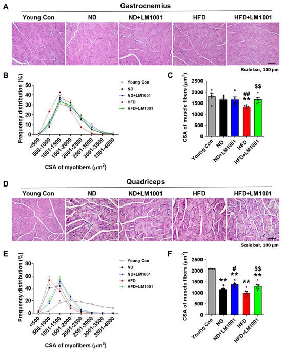 Effect of LM1001 on myofiber CSA in skeletal muscle of aged mice. Aged mice (55 weeks old) were fed either ND or HFD for 20 weeks and then sacrificed. Healthy male 12-week-old mice fed ND were used as a young control group. (A) Representative images of H&E staining, (B) Frequency distribution of CSA of myofibers, and (C) the mean CSA of myofibers from gastrocnemius sections. (n = 5). (D) Representative images of H&E staining. (E) Frequency distribution of CSA of myofibers, and (F) the mean CSA of myofibers from quadriceps sections of aged mice (n = 4–5). Data are presented as the mean ± SEM. ** p < 0.01 versus young control group, # p < 0.05, ## p < 0.01 versus ND group, and $$ p < 0.01 versus HFD group. Scale bar, 100 μm.