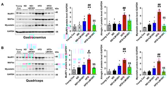 The effect of LM1001 on the expression of muscle atrophy proteins was investigated with the use of Western blot analysis in the skeletal muscle of mice. The levels of muscle atrophy proteins, MuRF1, Atrogin-1, and Myostatin, were significantly increased in gastrocnemius and quadriceps tissues of HFD-fed aged mice, compared to young and ND-fed aged mice; however, the levels were decreased by LM1001 (Figure 3A,B).