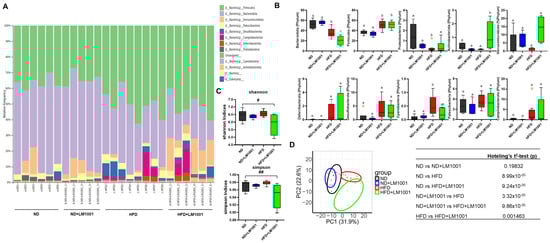 Effects of LM1001 on the abundance and diversity of gut bacteria in the feces of aged mice. Aged mice (55 weeks old) were fed either ND or HFD for 20 weeks, and then the feces were collected (n = 5–8). (A) A bar graph of bacterial composition at the phylum level from the feces of each mouse. (B) Specific phylum comparisons between groups. The results are shown as a plot with Tukey whiskers, and different letters above each bar represent significant differences between groups (n = 5–8, p < 0.05). (C) Gut bacterial alpha diversity was estimated by Shannon or Simpson indices (n = 4–6). Data are presented as the mean ± SEM. # p < 0.05, ## p < 0.01 versus ND group. (D) Gut bacterial beta diversity was estimated by Principal coordinates analysis corresponding to the Bray–Curtis dissimilarity index with differential contribution factors. Different letters of the clusters represent significant differences between groups by Hotelling’s T2 test (lower table, p < 0.05).