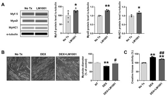 To directly investigate the effects of LM1001 on myoblasts, mouse myoblast C2C12 cells were treated with LM1001, and the myogenic and atrophic effects of LM1001 were examined. Cells were cultured for 24 h in DM containing LM1001 to determine how LM1001 influences myogenic differentiation. The protein levels for myogenic markers, Myf-5, MyoD, and MyHC1, were upregulated by LM1001 (Figure 8A). Next, to examine the effect of LM1001 on muscle atrophy, cells were differentiated for 7 days in DM containing LM1001, then treated for 2 days with dexamethasone (a synthetic glucocorticoid) to induce muscle atrophy. The diameter of myotubes was decreased by dexamethasone, but this reduction was significantly restored by LM1001 (Figure 8B). Consistent with this observation, the activity of creatine kinase, an indicator of muscle injury, was also reduced by LM1001 (Figure 8C). These results suggest that LM1001 prevents dexamethasone-induced muscle atrophy.