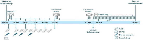 Participants arrived at the laboratory at 08:00 after a 12 h overnight fast (Figure 1). On arrival, they completed the Leeds Food Preference Questionnaire (LFPQ). At ~08:15, participants began a mixed-meal tolerance test (MM-TT). Baseline appetite ratings (hunger, fullness, satisfaction, prospective food consumption) were recorded using visual analogue scales (VAS) [36], and a fasting venous blood sample was taken before consumption of a standardised meal (08:15–08:30). VAS ratings were then completed every 30 min for 240 min, with additional venous blood samples collected at 30, 60, and 120 min post-meal. At 13:00 (30 min after the MM-TT) and 17:00, participants consumed ad libitum lunch and dinner meals and were then provided with an evening snack bag to consume as desired until the next morning. Food intake from the snack bag was recorded the following day.