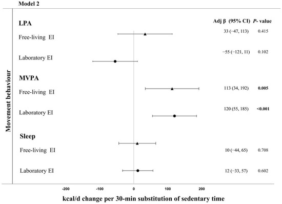 Based on food diary records, reallocating 30 min of sedentary time to MVPA was associated with a 113 (34, 192) kcal·d−1 higher daily energy intake (p = 0.005) (Figure 2, Model 2). Reallocating time from sedentary time to LPA or sleep was unrelated to daily energy intake measured via food diaries. Based on laboratory measured energy intake, reallocating 30 min of sedentary time to MVPA was associated with a 120 (55, 185) kcal·d−1 higher daily energy intake (p < 0.001) (Figure 2, Model 2). Reallocating time from sedentary time to LPA or sleep was not associated with energy intake measured in the laboratory.