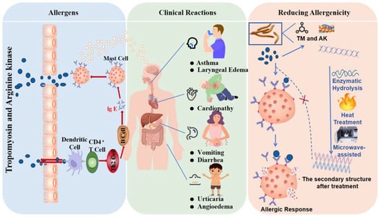 - He, W.; He, K.; Sun, F.; Mu, L.; Liao, S.; Li, Q.; Yi, J.; Liu, Z.; Wu, X. Effect of Heat, Enzymatic Hydrolysis and Acid-Alkali Treatment on the Allergenicity of Silkworm Pupa Protein Extract. Food Chem. 2021, 343, 128461. [Google Scholar] [CrossRef]