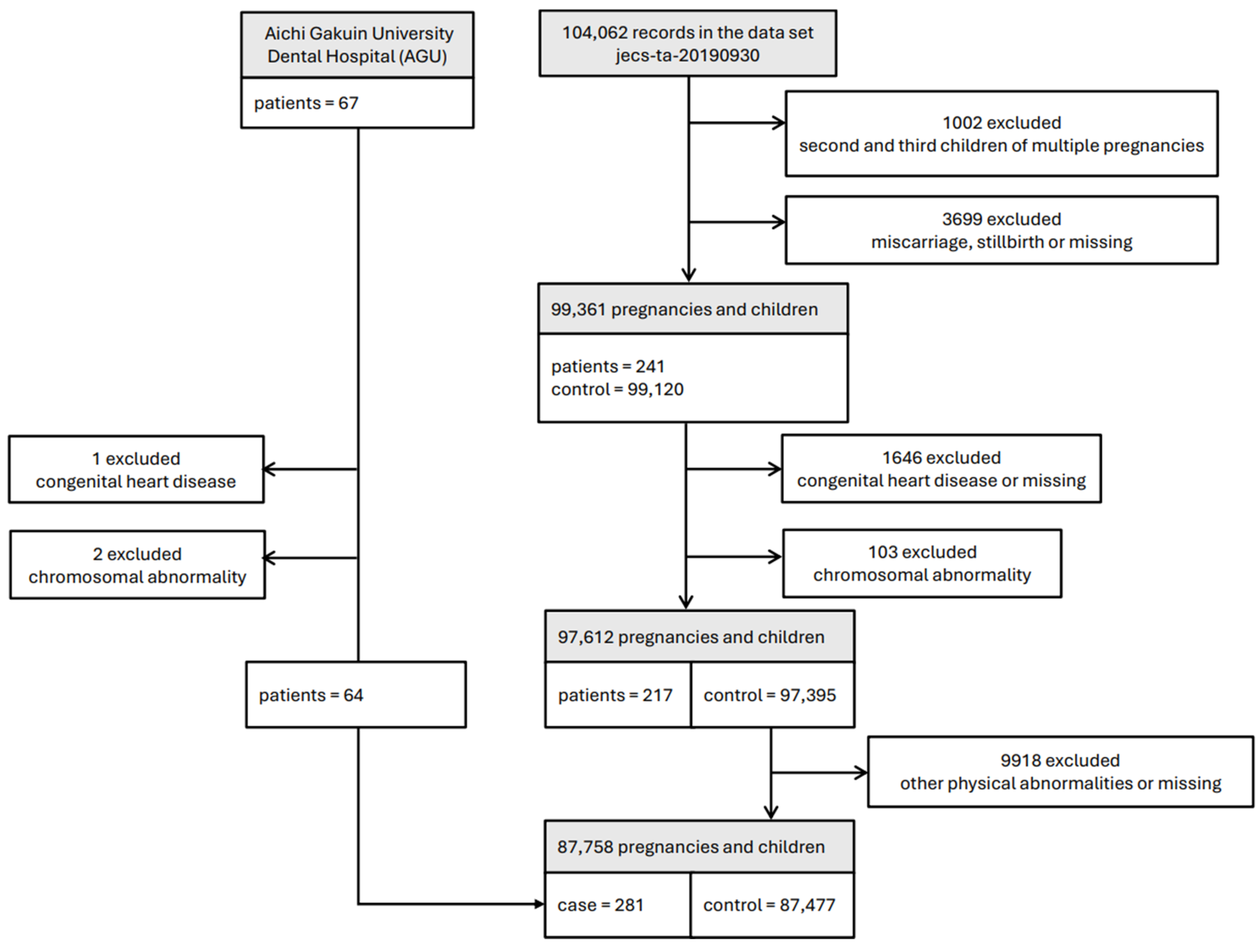 - Sato, Y.; Yoshioka, E.; Saijo, Y.; Miyamoto, T.; Sengoku, K.; Azuma, H.; Tanahashi, Y.; Ito, Y.; Kobayashi, S.; Minatoya, M.; et al. Population Attributable Fractions of Modifiable Risk Factors for Nonsyndromic Orofacial Clefts: A Prospective Cohort Study From the Japan Environment and Children’s Study. J. Epidemiol. 2021, 31, 272–279. [Google Scholar] [CrossRef]