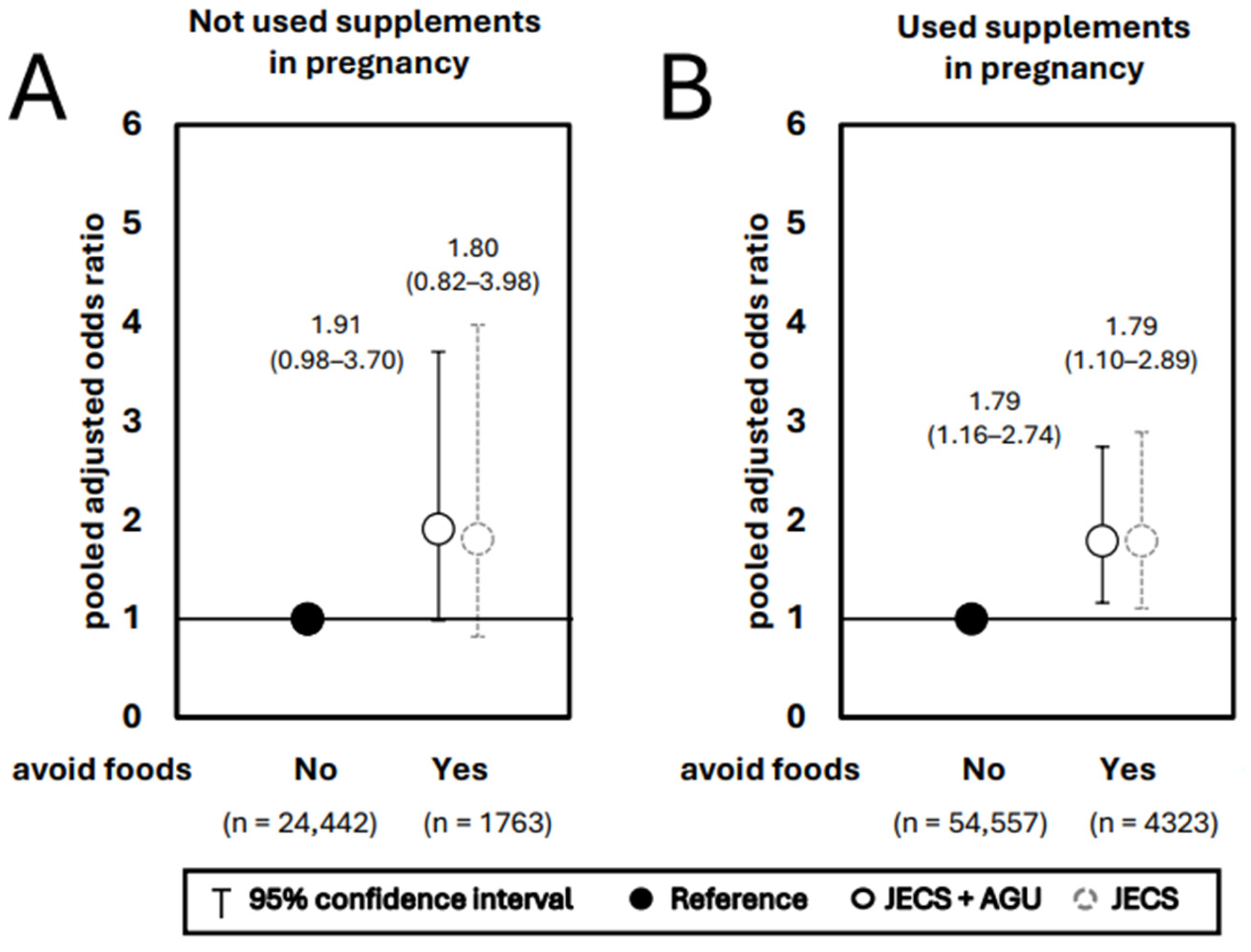Fujiwara K, Tamada H, Imura H, Matsuki T, Furukawa H, Natsume N, Yamada Y, Ebara T, Kamijima M, The Japan Environment and Children’s Study (JECS) Group. Effects of Food Preferences and Supplement Intake During Pregnancy on the Cleft Lip and Palate Incidence: The Japan Environment and Children’s Study. Nutrients. 2025; 17(19):3175. https://doi.org/10.3390/nu17193175