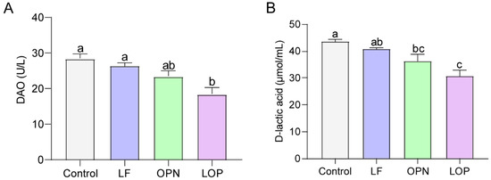 The combined effects of LF and OPN on intestinal permeability in 21-day-old mice. (A) Serum DAO activity. (B) Serum D-lactate levels. Data are presented as mean ± SD (n = 6). Significant differences, determined by one-way ANOVA, are denoted by different superscript letters (a, b, c) (p < 0.05).