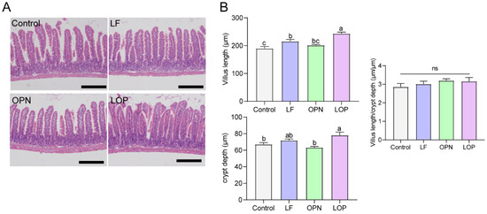 The combined effects of LF and OPN on intestinal structure in 21-day-old mice. (A) Representative images of HE-stained jejunal epithelium in mice (10×, scale bar = 200 µm). (B) Villus length, crypt depth, and the ratio of villus length to crypt depth. Data are presented as mean ± SD (n = 6). Significant differences, determined by one-way ANOVA, are denoted by different superscript letters (a, b, c) (p < 0.05); ns: not significant.