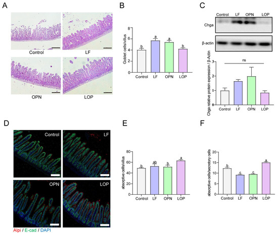 Effect of LF in combination with OPN on intestinal epithelial cells composition in 21-day-old mice. (A,B) Representative bright-field images and quantification of PAS staining used to indicate goblet cells (10×, scale bar = 200 µm). (C) The relative expression level of chga at the protein level is used to indicate the level of intestinal endocrine cells. (D–F) Representative immunofluorescence images of absorptive cells (Alpi+) and quantification in each villus. (10×, scale bar = 100 µm). (F) The ratio of absorptive cells to secretory cells. Data are presented as mean ± SD (n = 6). Significant differences, determined by one-way ANOVA, are denoted by different superscript letters (a, b, c) (p < 0.05); ns: not significant.