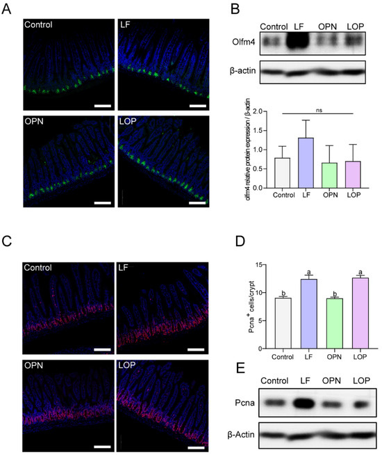 Effect of LF in combination with OPN on intestinal stem cell activation in 21-day-old mice. (A) Representative fluorescence images of intestinal stem cells (Olfm4+) (10×, scale bar = 100 µm). (B) Western blot analysis of Olfm4 expression in crypts. (C,D) Representative fluorescence images and quantitative analysis of transit-amplifying cells (Pcna+) in crypts (10×, scale bar = 100 µm). (E) Western blot analysis of hes1 expression in crypts. Data are shown as mean ± SD, n = 3. Data are presented as mean ± SD (n = 6). Significant differences, determined by one-way ANOVA, are denoted by different superscript letters (a, b, c). (p < 0.05); ns: not significant.