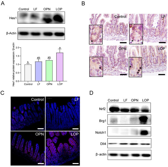 Effect of LF in combination with OPN on Notch signaling pathway in 21-day-old mice. (A,B) Western blot analysis and representative IHC images of the target protein Hes1 in the jejunum. The asterisk “*” indicates the cells marked with "hes1" (20×, scale bar = 100 µm). (C) Immunostaining images showing the expression of Notch1 receptor in the jejunum (10×, scale bar = 100 µm). (D) Western blot analysis of the transcription factors Nrf2 and Brg1, Notch1 receptor, and Dll4 ligand in the Notch pathway. Data are presented as mean ± SD (n = 6). Significant differences, determined by one-way ANOVA, are denoted by different superscript letters (a, b, c) (p < 0.05).