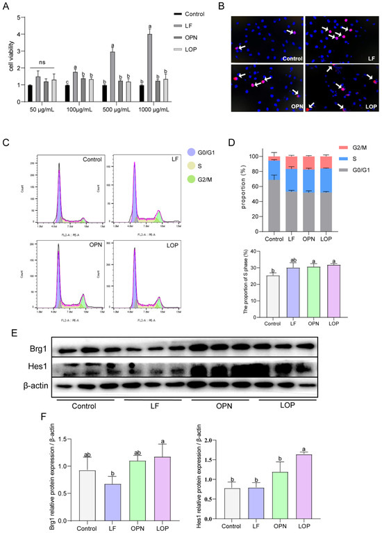 Effect of LF in combination with OPN on the Notch signaling pathway in IEC-6 cells. (A) Viability of IEC-6 cells after treatment with different concentrations of LF, OPN, and LOP. (B) Proliferation capacity of IEC-6 cells characterized by EDU staining. The arrow indicates the proliferating cells. (C) Changes in the cell cycle of IEC-6 cells after treatment with complete LF, OPN, and LOP. (D) Proportion of cells in each phase of the cell cycle and the proportion of S-phase cells under different treatments. (E,F) Western blot analysis of key Notch signaling proteins Hes1 and Brg1 in IEC-6 cells after administration with complete LF, OPN, and LOP. Data are presented as mean ± SD (n = 6). Significant differences, determined by one-way ANOVA, are denoted by different superscript letters (a, b, c) (p < 0.05); ns: not significant.