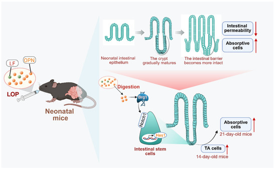 Mechanism by which LF combined with OPN (LOP) promotes intestinal epithelial maturation. LOP upregulates the expression of the transcription factor Brg1, which subsequently activates Notch signaling and promotes the transcription of its downstream target gene, Hes1. This cascade drives the directional differentiation of intestinal stem cells into absorptive epithelial cells. This regulation exhibits time-dependent characteristics: an increase in TA cells at day 14 provides a cellular reservoir for subsequent differentiation, while a significant increase in mature absorptive cells is observed at day 21. These cellular changes are accompanied by reduced intestinal barrier permeability and improved structural integrity, ultimately leading to the functional maturation of the intestine.