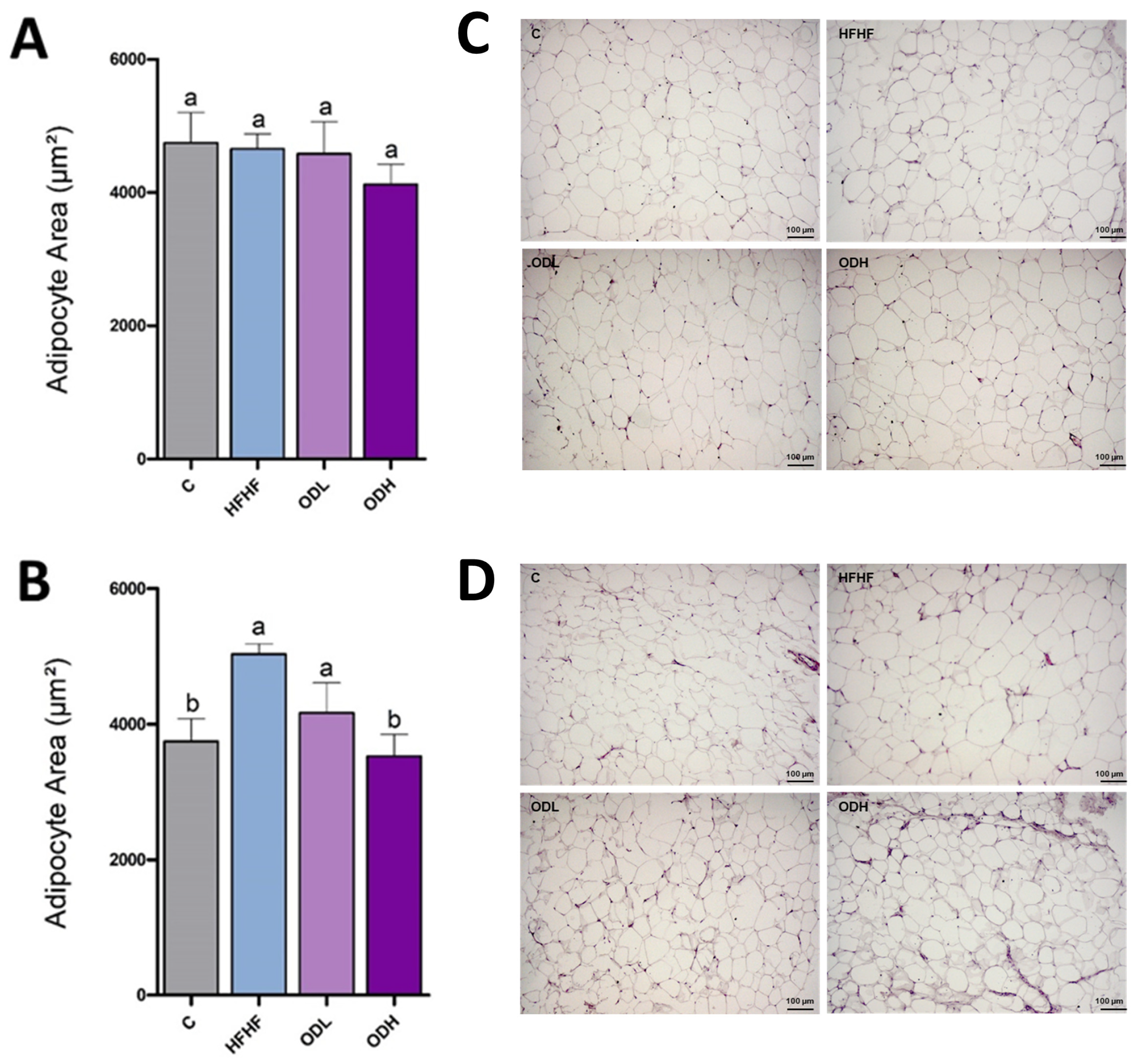 Total white AT weight (g) | 40.7 ± 2.2 c | 61.0 ± 2.3 a | 50.5 ± 4.0 b | 53.0 ± 3.3 b | p < 0.05 |