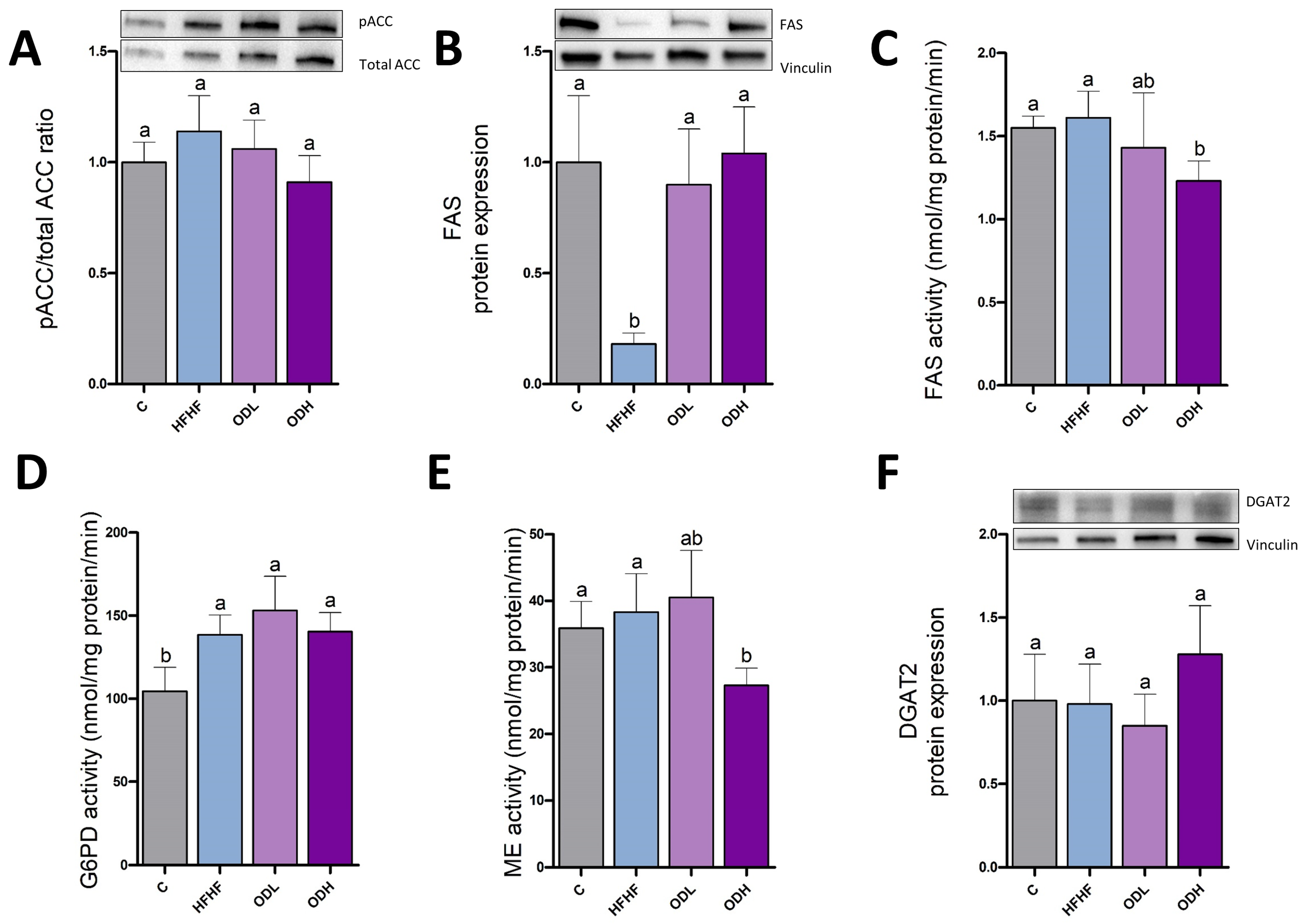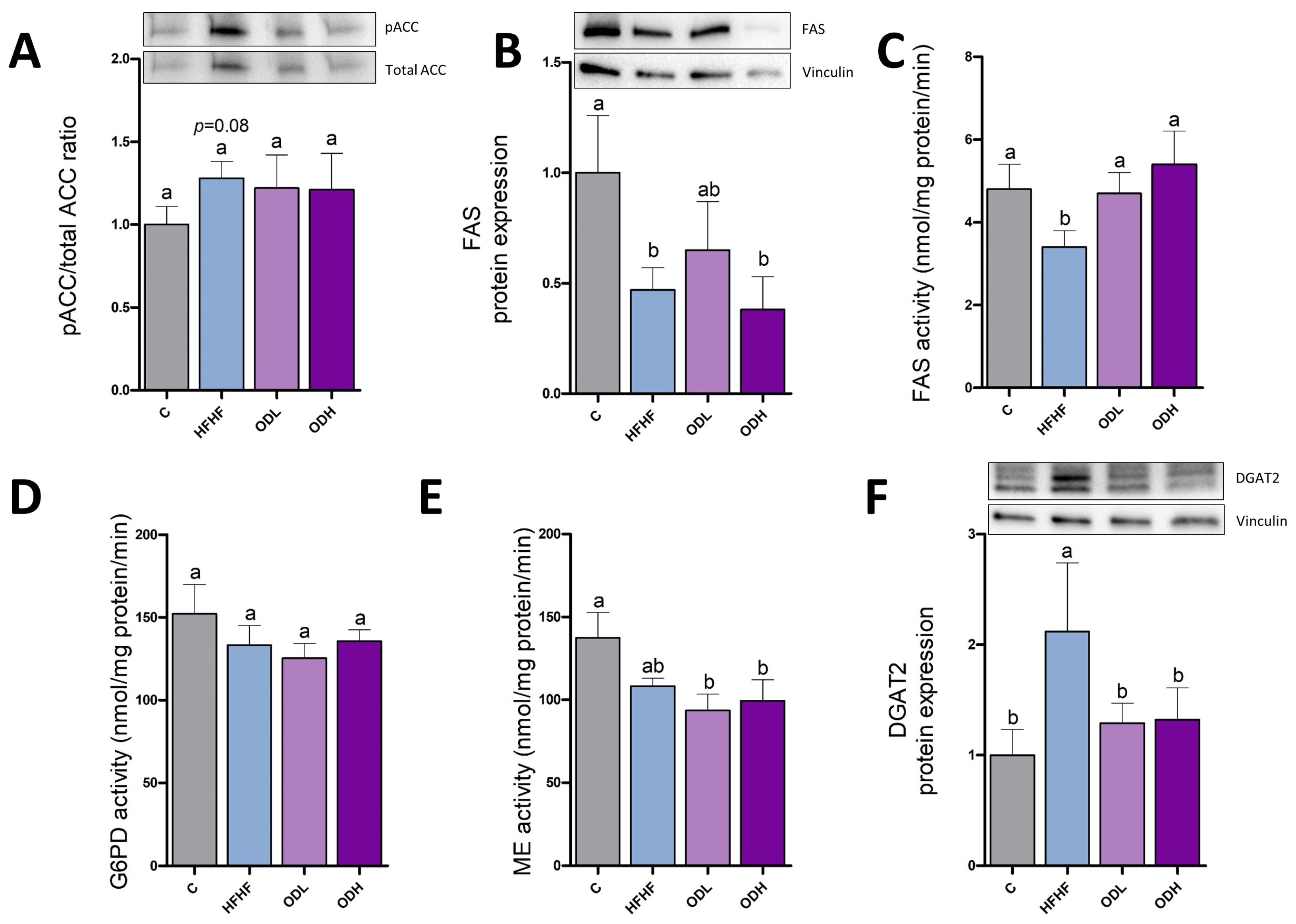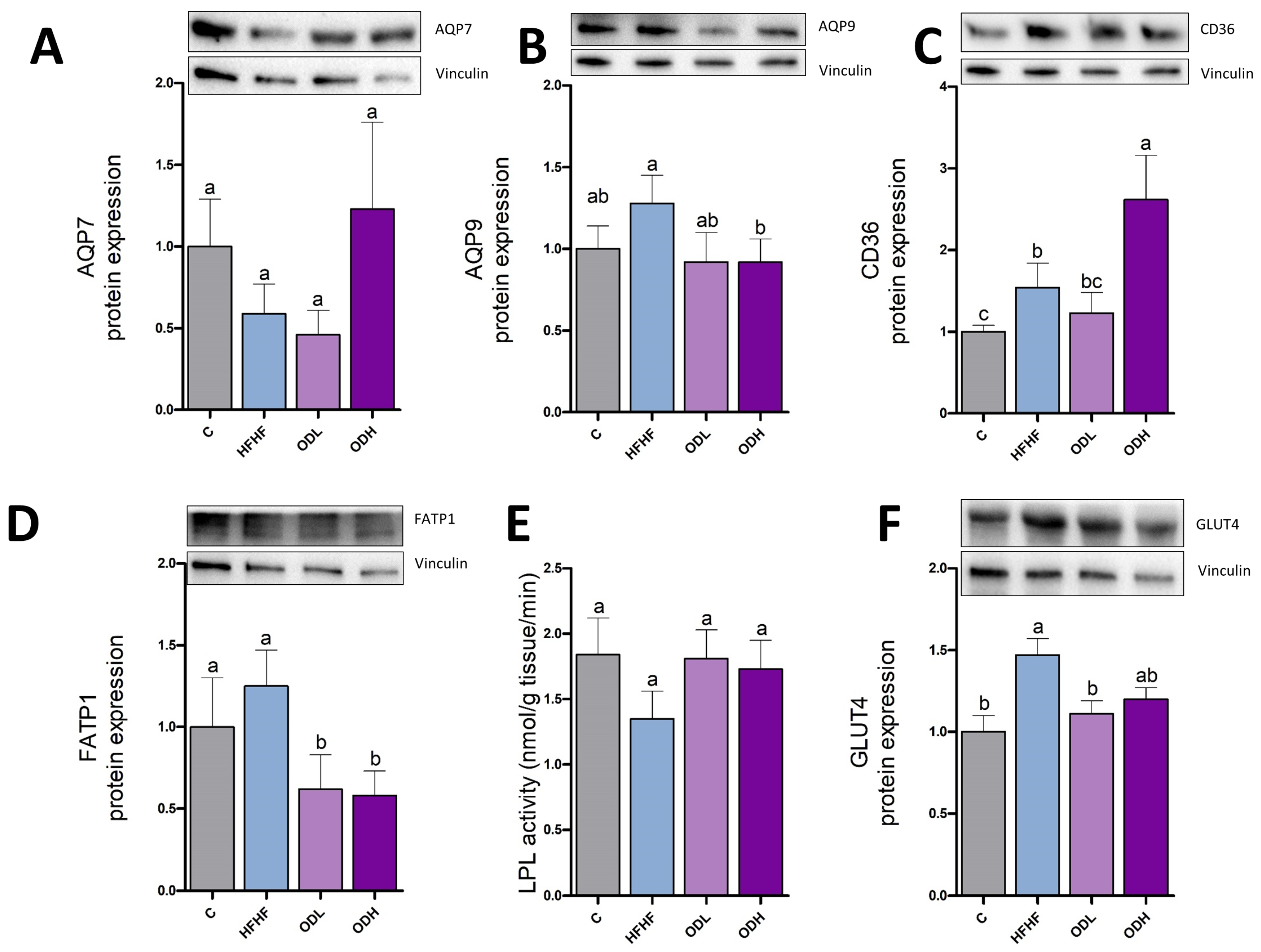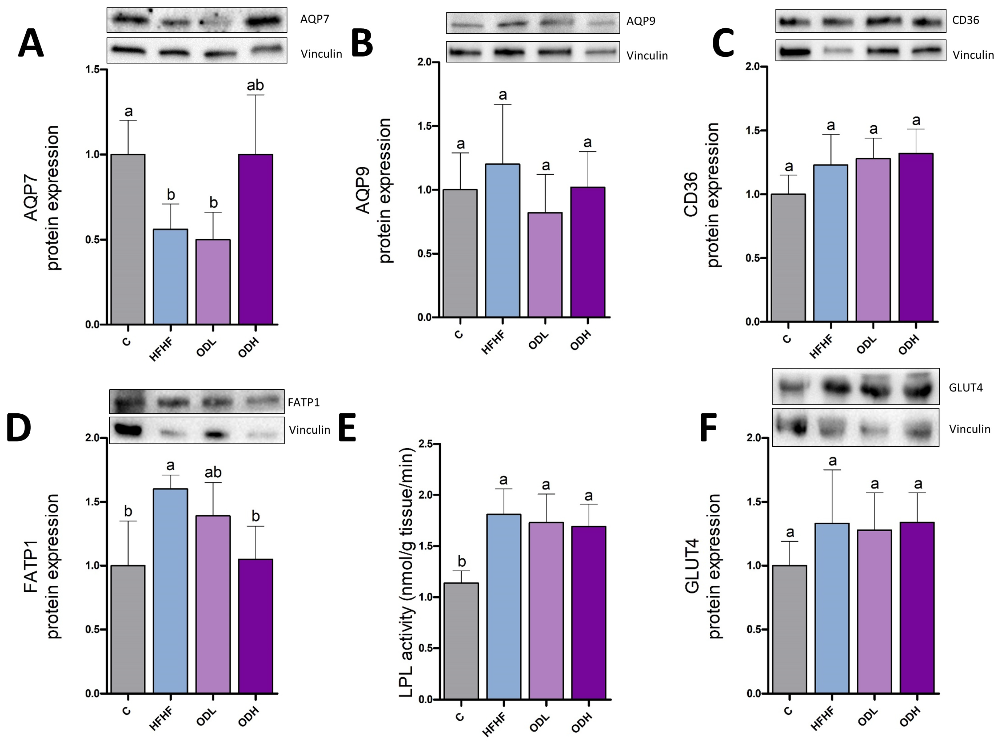 Visceral AT weight (g) | 30.8 ± 2.8 b | 43.7 ± 1.4 a | 36.4 ± 3.2 b | 36.4 ± 2.3 b | p < 0.05 |