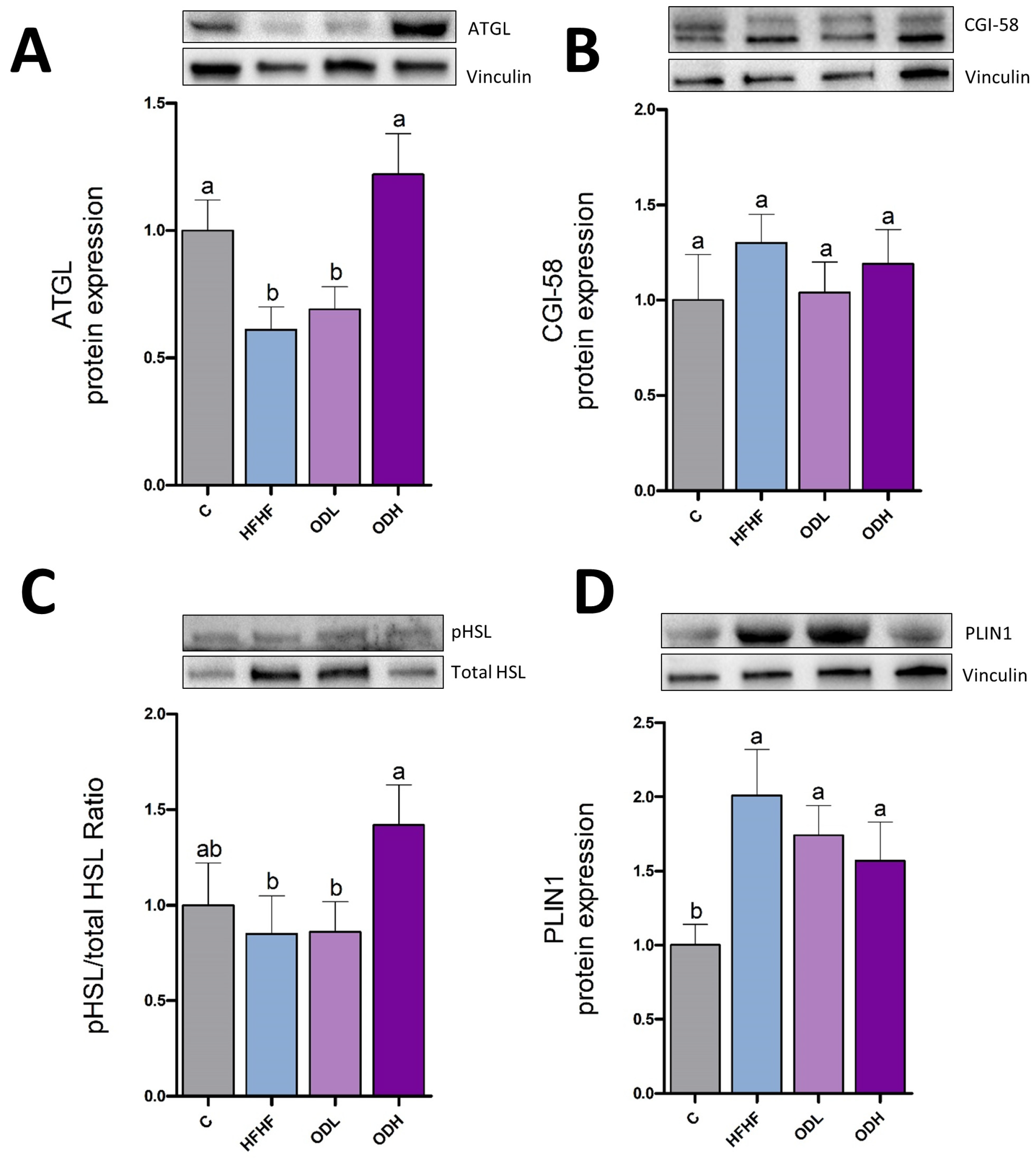 Subcutaneous AT weight (g) | 13.4 ± 0.7 b | 19.0 ± 0.9 a | 16.5 ± 1.2 a | 16.6 ± 1.3 a | p < 0.05 |