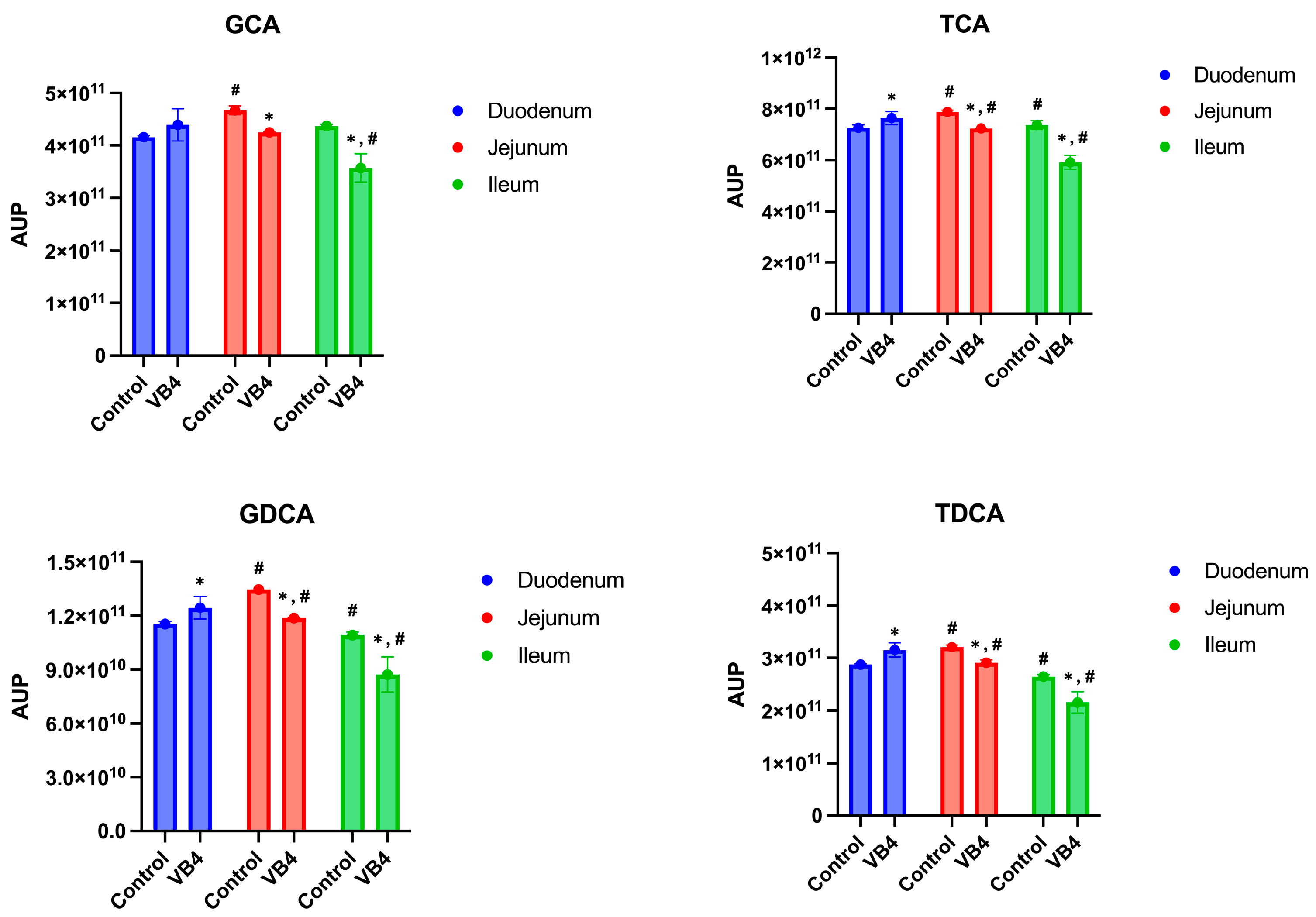 3.3. Semi-Quantitative Analysis of BAs in Small Intestine and Colon