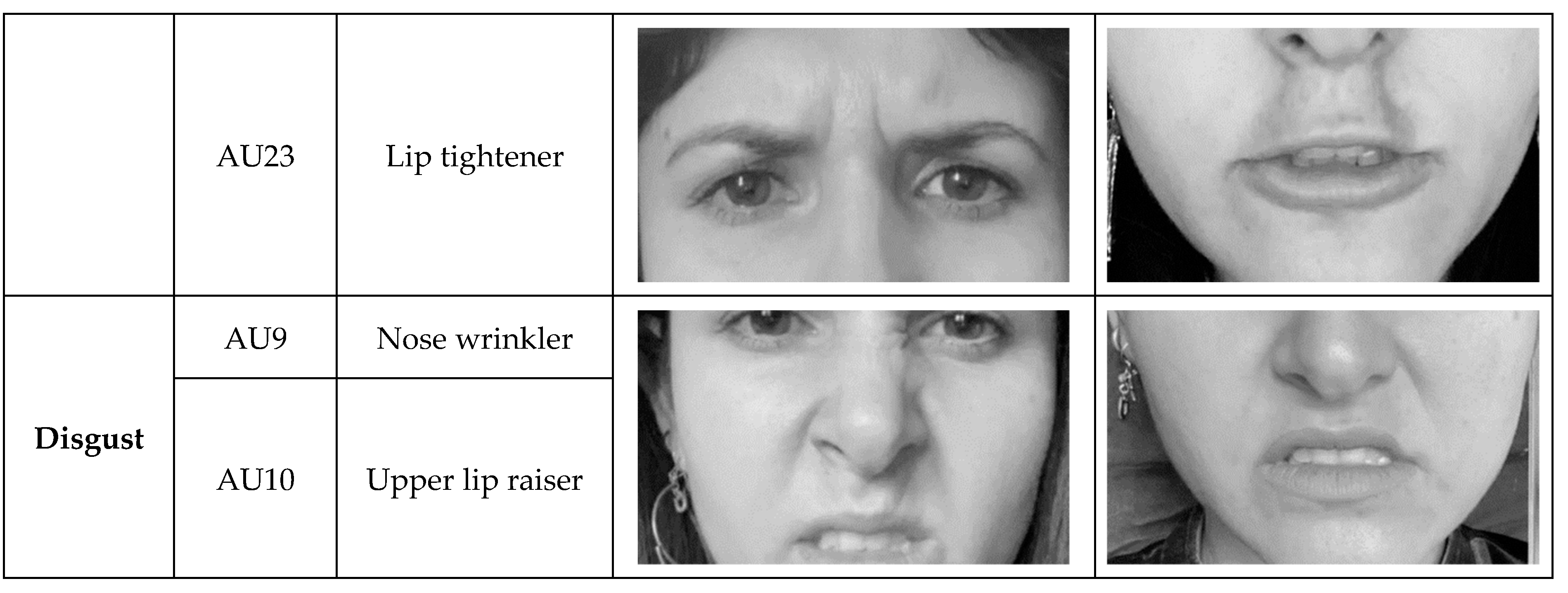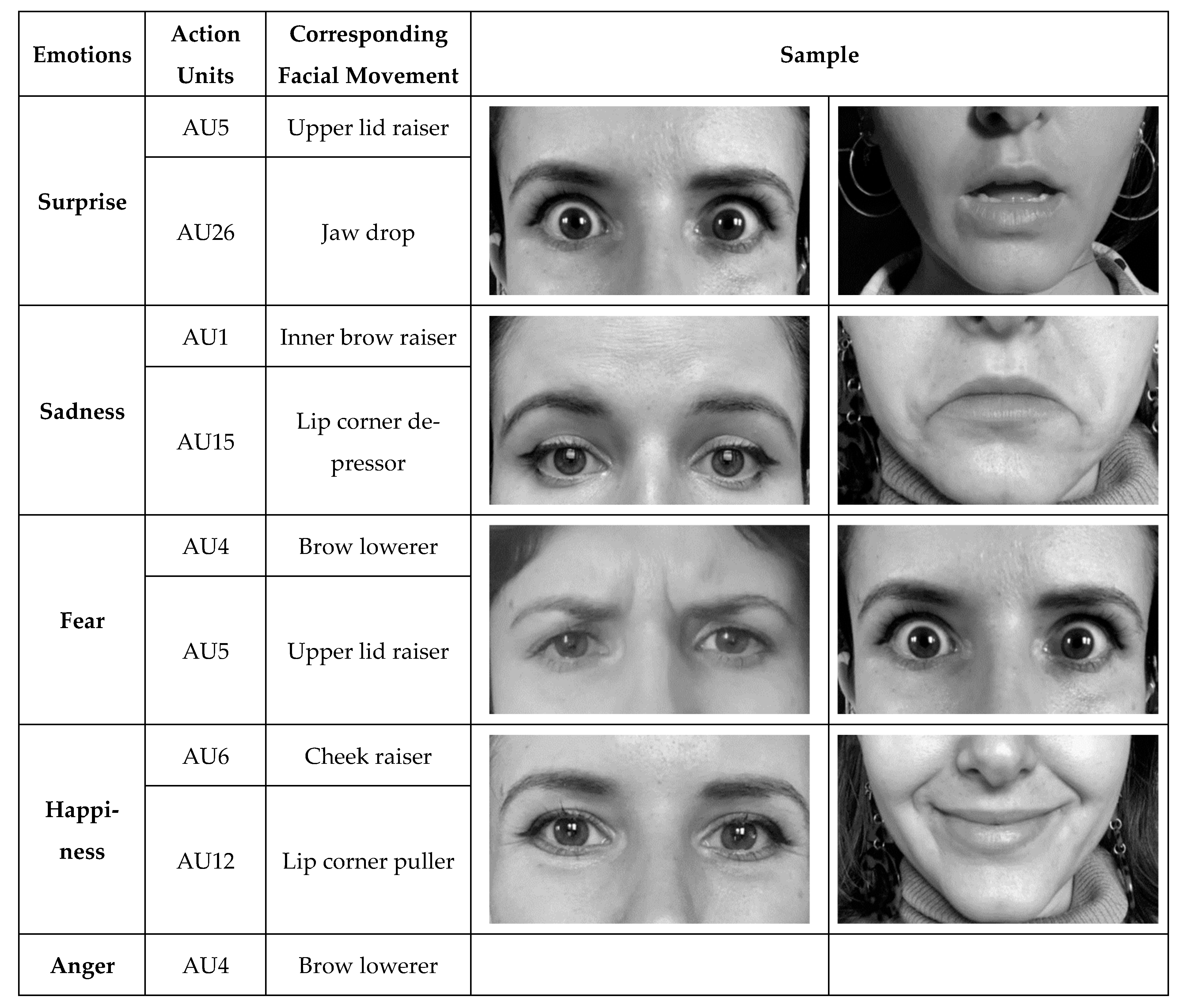 The recorded videos were then processed using OpenFace 2.0 on a Windows-based computer. Although the software can analyze 18 separate AUs, this study focused on AUs pertinent to emotional expressions (Figure 1). OpenFace computes a confidence score for every frame, which decreases in lower-quality situations, such as significant movements of the head or when the face is partially obstructed by an object or an extremity. Frames scoring below 90% confidence, constituting fewer than 1% of the total frames, were omitted from further examination to achieve higher reliability.