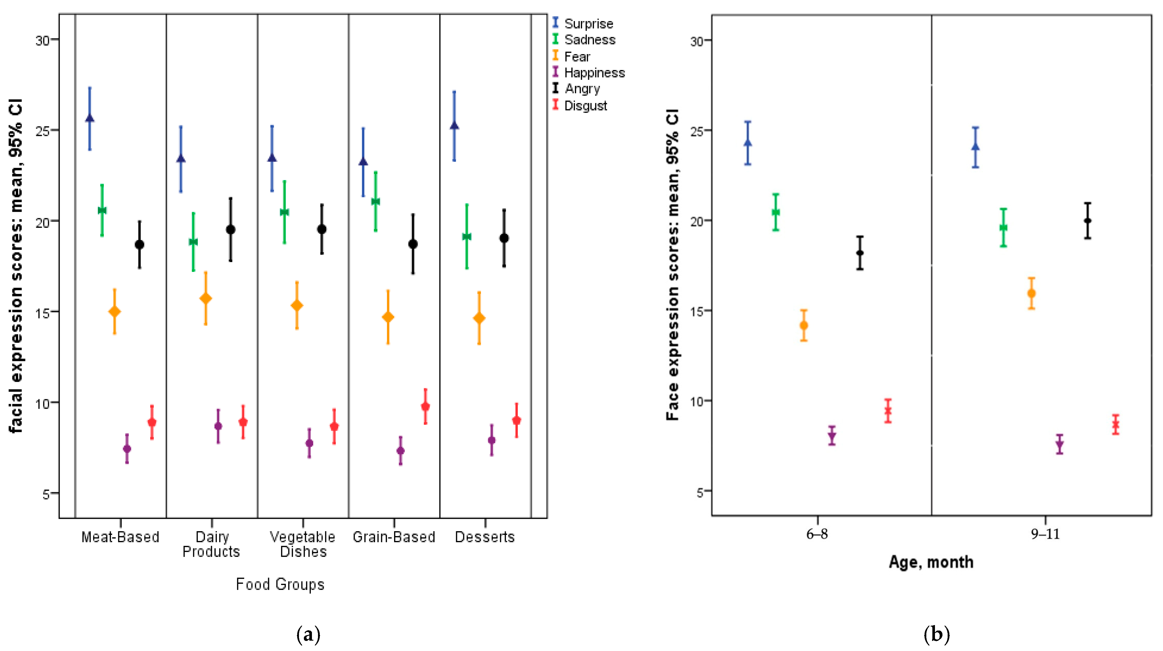 Although mean scores varied slightly, no statistically significant differences in any of the six measured emotions emerged across the five food groups (Figure 2). Despite the lack of within-subject effects by food type, multiple between-subject factors (maternal and infant characteristics, as well as food preparation practices) were significantly associated with specific emotional responses in infants (Table 4 and Figure 3).