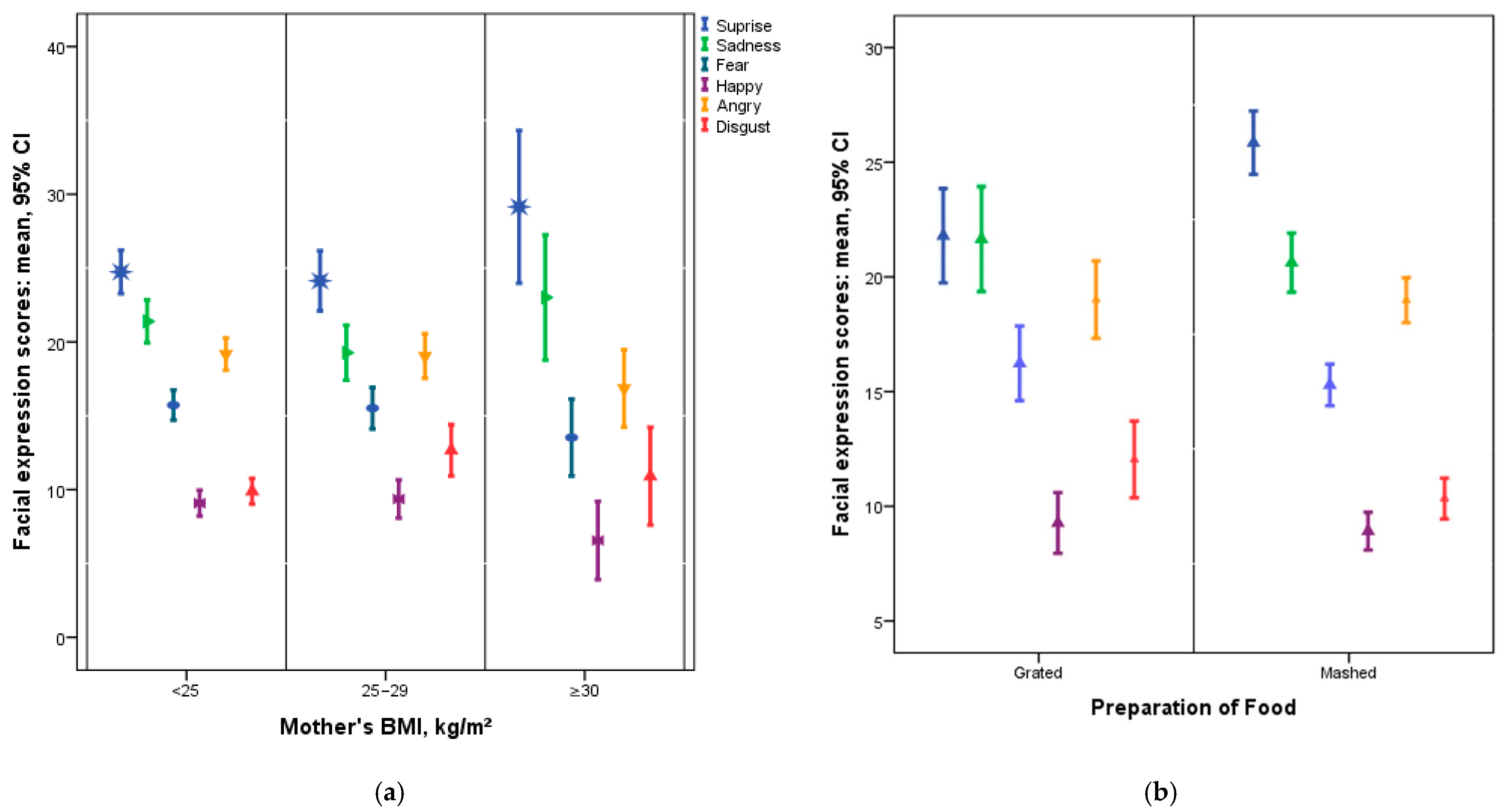 Surprise: Infants of mothers with BMI > 30 km/m2 displayed significantly higher levels of surprise (26.3 [24.2–28.4]) than those of mothers with BMI <25 km/m2 (23.0 [21.4–24.6]) or BMI 25–29 km/m2 (22.8 [20.9–24.8]) (p = 0.007). Female infants (24.3 [22.8–25.9]) showed slightly higher levels of surprise than male infants (23.7 [22.1–25.3]) (p = 0.002). Infants presented with mashed foods (25.5 [24.2–26.8]) demonstrated higher levels of surprise compared to those offered grated foods (22.6 [20.7–24.4]) (p = 0.002)m.