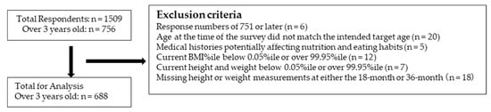 Among children ≥3 years, participants with response numbers ≥ 751 (n = 6), whose age at the time of the survey did not match the intended target age (n = 20), with medical histories potentially affecting nutrition and eating habits (n = 5), with a current BMI percentile < 0.05 or >99.95 (n = 12), with a current height or weight percentile < 0.05 or >99.95 (n = 7), and missing height or weight measurements at either the 18-month or 36-month checkups (n = 18) were excluded. Thus, 688 participants were included in the final analysis (Figure 1), with 193 (28.1%) and 495 (71.9%) in the AR and non-AR groups, respectively.