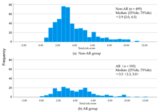 The median total risk score for staple foods, main dishes, and side dishes was 2.9 in the non-AR group, with the histogram peak near the median. In contrast, the AR group had a median score of 3.5, with a second peak adjacent to 4–6 points (Figure 2). The risk scores for staple foods (p = 0.018) and the total risk score for staple foods, main dishes, and side dishes (p = 0.038) were higher in the AR group (Table 3). In contrast, no significant differences were observed in the risk scores for main dishes and side dishes.
