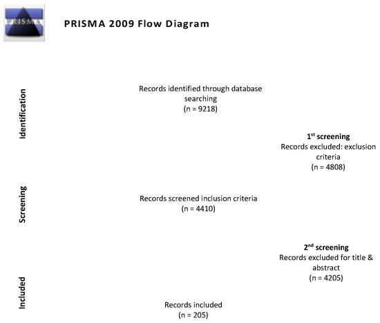The search strategy used in the WOSCC yielded a total of 9218 records. After the application of the inclusion and exclusion criteria, the resulting articles numbered 4410. Lastly, after the assessment of the titles and abstracts, a total of 205 articles were included in the analysis. The entire process is shown in the PRISMA flow diagram below (Figure 1).