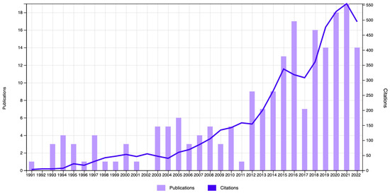 The first article recorded on the subject was published in 1980, and no other records were found until 1991. Figure 2 shows the distribution of the number of publications in the WOSCC database per year and citations, from 1991 until 2022. The year 2023 was not considered, as the search took place in the middle of that year, and the information would therefore be incomplete. On the other hand, an exponential growth can be observed in the last 15 years, with 2021 being the most productive year, with a total of 19 publications.