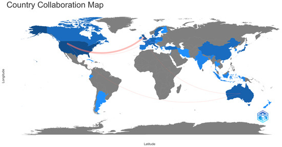 Among the countries with the most publications on the subject, we found the USA (n = 49, 23.9%), the UK (n = 32, 15.61%), Australia (n = 15, 7.32%), Italy (n = 14, 6.83%), and Japan (n = 13, 6.34%). Likewise, it was observed that the countries with the highest number of collaborations were the USA and the UK, followed by the USA and the Netherlands, the USA and Australia, the UK and Sweden, the UK and Australia, and the UK and Austria (Figure 3).