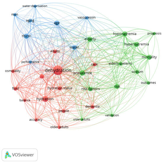 - Cluster 3 (eight items, blue colour): age, aging, men, performance, thirst, vasopressin, water, and water deprivation.