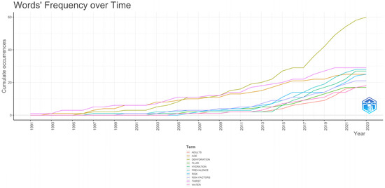The last cluster (blue) is related to the physiopathology of dehydration, with words such as vasopressin or water deprivation. The physiological process found in a healthy adult to compensate for a reduced blood volume is a cascade of reactions known as the renin–angiotensin system [48]. Due to the pathophysiology of older people and how it affects their water homeostasis, in earlier studies, the word “thirst” was used to refer to dehydration. However, starting in 2010 (with the start of exponential growth in the number of publications), the term evolved to ‘dehydration’, as it is the final result in many conditions, among which we find the decrease in thirst. In addition, why does this alteration in thirst occur? It is a physiological aspect of the aging process and is associated with alterations in water homeostasis, which occur with advancing age. Older adults can experience diurnal fluctuations in the secretion of antidiuretic hormone (ADH) or arginine vasopressin (AVP). Thus, water homeostasis acts in parallel to restore these liquids [49]. When intracellular dehydration occurs, the osmoreceptors also signal the hypothalamus to induce the stimulation of the feeling of thirst [50]. Older adults also have a weaker sense of thirst, which is activated late, as compared to other adults. Thus, it is common to see a related hypodipsia in older adults [48]. All of this could explain the association of these keywords with the last cluster.