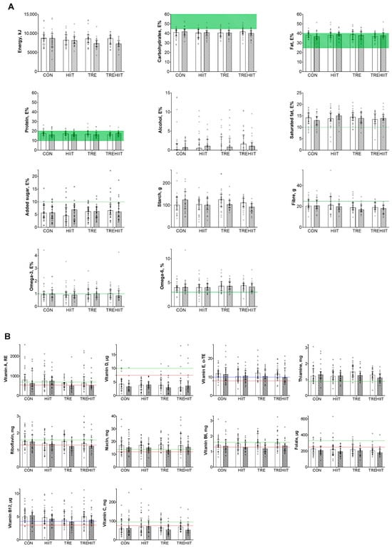 Physical exercise is the second cornerstone in the treatment of excess body fat stores, by increasing energy expenditure and promoting metabolic adaptations to support weight loss and cardiometabolic health. High-intensity interval training (HIIT) is an effective exercise strategy for improving cardiorespiratory fitness and reducing fat mass [14]. Intensive exercise can also acutely suppress appetite hormones, and exercise training may positively impact appetite regulation and reduce susceptibility to excessive energy intake [15,16]. Although some studies have shown shifts towards healthier dietary patterns after an HIIT intervention in young, normal-weight adults [17], others showed increased preference for high-energy, sugary foods, and reduced fiber intake after HIIT in middle-aged sedentary adults [18]. More research is needed on how high-intensity exercise influences total energy intake and nutrient composition. In this secondary analysis of a randomized controlled trial (RCT), we report the effects of 7 weeks of TRE, HIIT, or a combination (TREHIIT) versus a control group (CON) on energy, macronutrient, and micronutrient intakes in women with a body mass index (BMI) ≥ 27 kg/m2 [19].