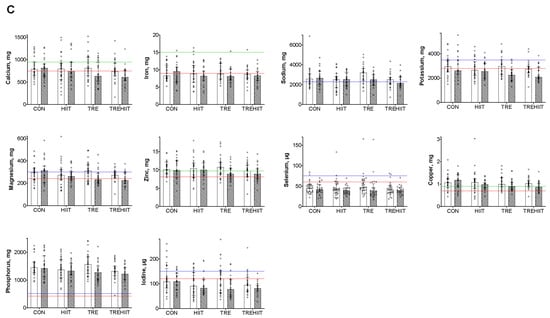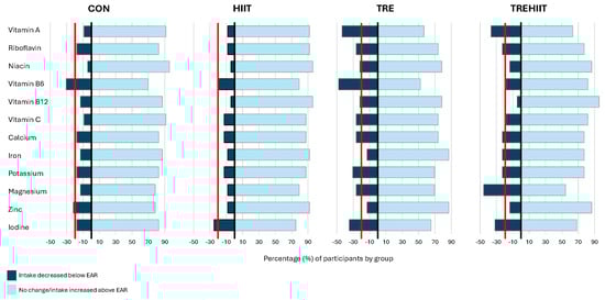 Figure 2 shows micronutrients for which ≥20% of participants in one or more groups had a micronutrient intake shifting from above the EAR at baseline to below the EAR at the end of the intervention period. There were 10 micronutrients for which ≥20% of participants had intakes that decreased below the respective EARs at the end of the intervention in TRE, 7 micronutrients in TREHIIT, 2 in HIIT, and 2 in CON. The highest prevalence of an intake decreasing below the EAR was observed in TREHIIT for magnesium, in which 45.5% of the participants shifted from above the EAR to below the EAR.