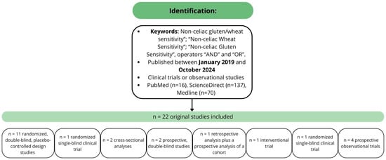 This narrative review aims to describe the updated state of the art of NCGWS in the last five years. Two independent authors (F.M. and L.L.) performed a comprehensive and independent literature search on PubMed, MEDLINE, and ScienceDirect using the following search terms in the title and abstract: “Non-celiac gluten/wheat sensitivity”; “Non-celiac Wheat Sensitivity”; and “Non-celiac Gluten Sensitivity”, operators “AND” and “OR”. Only articles (1) consistent with the topic; (2) with an original randomized controlled trial (RCT); (3) published in the last five years, from January 2019 to October 2024; (4) written in English; (5) listed as research articles; and (6) available in full text were included in this narrative analysis. Related results fitting the research criteria were also considered. Records were subsequently reviewed by the other authors. Any disagreements between F.M. and L.L. were resolved by consensus with G.C. and R.D.G. Three papers have been excluded because they were not relevant for the aims of this review [,,]. Articles not addressing the inclusion criteria, duplicates, and incomplete articles or those with unclear outcomes were excluded from this review.