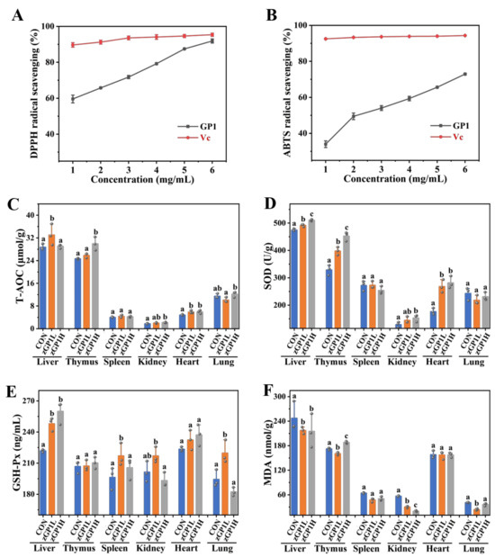 Antioxidant capacity of GP1. (A) DPPH radical scavenging. (B) ABTS radical scavenging. (C) The content of T-AOC. (D) The content of SOD. (E) The content of GSH-Px. (F) The content of MDA. The values are presented as mean ± SD, (n = 3). Different lowercase letters represent significant differences between the two groups (p < 0.05). Vc—vitamin C; CON—control group; GP1L—Glycyrrhiza polysaccharide low dose; GP1H—Glycyrrhiza polysaccharide high dose.