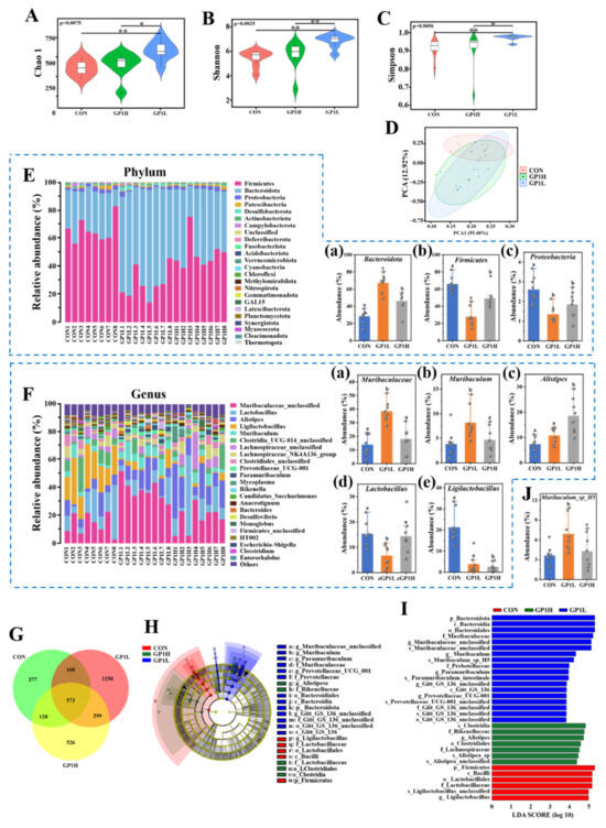Effect of GP1 on gut microbiota structure of healthy mice. (A) Diversity analysis of gut microbiota: Chao 1 (p = 0.0075). (B) Diversity analysis of gut microbiota: Shannon (p = 0.0025). (C) Diversity analysis of gut microbiota: Simpson (p = 0.0056). (D) β-diversity. (E) Composition of gut microbiota (phylum): (a) abundance of Bacteroidota; (b) abundance of Firmicutes; (c) abundance of Proteobacteria. (F) The composition of gut microbiota (genus): (a) abundance of Muribaculaceae; (b) abundance of Muribaculum; (c) abundance of Alistipes; (d) abundance of Lactobacillus; (e) abundance of Ligilactobacillus. (G) Venn diagram. (H,I) LEfSe analysis. (J) Abundance of Muribaculum_sp_H5. The values are presented as means ± SD (n = 3). Different lowercase letters represent significant differences between the two groups (p < 0.05); * p < 0.05 and ** p < 0.01. CON—control group; GP1L—Glycyrrhiza polysaccharide low dose; GP1H—Glycyrrhiza polysaccharide high dose.