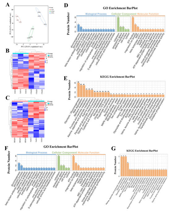 Functional prediction and pathway enrichment of differential proteins in the gut microbiota treated with GP1 and saline. (A) PCA analysis of proteins. (B) Differential protein—GP1L group. (C) Differential protein—GP1H group. (D) Function prediction of differential protein by GO–GP1L. (E) Pathway enrichment of differential protein by KEGG–GP1L. (F) Function prediction of differential protein by GO–GP1H. (G) Pathway enrichment of differential protein by KEGG–GP1H. CON—control group; GP1L—Glycyrrhiza polysaccharide low dose; GP1H—Glycyrrhiza polysaccharide high dose.