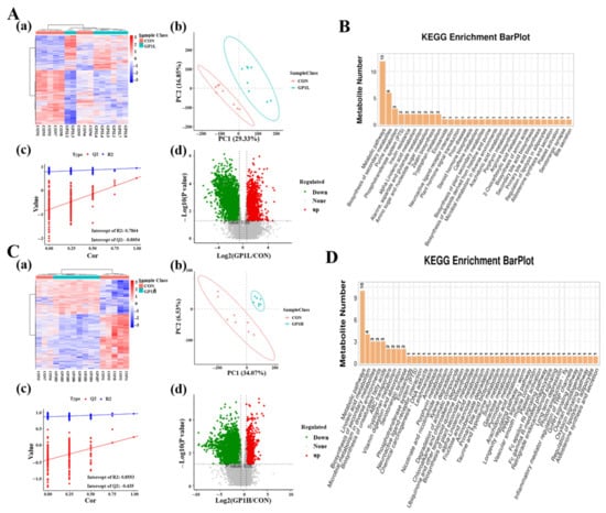 Differential metabolites in feces and their pathway enrichment. (A) Differential metabolites—GP1L group: (a) Heatmap; (b) PCA; (c) PLS-DA; (d) Volcano map. (B) Pathway enrichment of differential metabolites—GP1L group. (C) Differential metabolites—GP1H group: (a) Heatmap; (b) PCA; (c) PLS-DA; (d) Volcano map. (D) Pathway enrichment of differential metabolites—GP1H group. CON—control group; GP1L—Glycyrrhiza polysaccharide low dose; GP1H—Glycyrrhiza polysaccharide high dose.