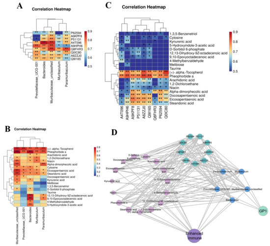 Relationship diagram of beneficial effects of GP1. (A) The correlation between dominant flora and differential proteins. (B) The correlation between dominant flora and differential metabolites. (C) The correlation between differential metabolites and differential proteins. (D) Probiotic pathway of GP1 to healthy. The light green circle represents GP1, the blue circle represents GP1L-dominant flora, the green circle represents differential protein, the light purple represents characteristic metabolites, and purple represents immune system. * p < 0.05 and ** p < 0.01. GP1—Glycyrrhiza polysaccharide 1.
