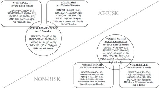 3.6. Differences Across At-Risk and Non-Risk Groups Based on DESA-6H and EAT-26 Scores in Nutrition Knowledge