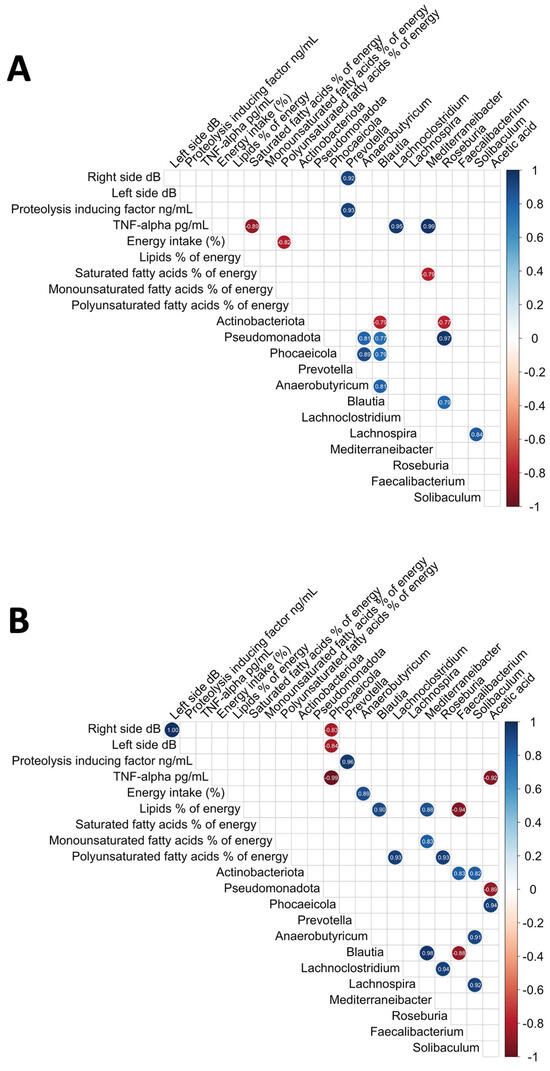 Several correlations were observed in the group that received high doses of DMB (Figure 2B). As a percentage of energy, Blautia and Mediterraneibacter were positively associated with lipids in the diet, whereas Faecalibacterium was negatively associated. Mediterraneibacter was positively correlated with dietary monounsaturated fatty acids. There was a positive correlation between dietary polyunsaturated fatty acids (PUFAs) and Lachnoclostridium and Roseburia. Dietary energy intake (%) was positively correlated with Anaerobutyricum. There was a negative correlation between the relative abundance of Phocaeicola and electrogustometry (both right and left sides of the tongue) and TNF-α levels. The PIF was positively correlated with the Prevotella genus. There was a positive correlation between Phocaeicola and plasma acetic acid concentration, whereas a negative correlation was detected between Pseudomonadota and acetic acid levels (Figure 2B).